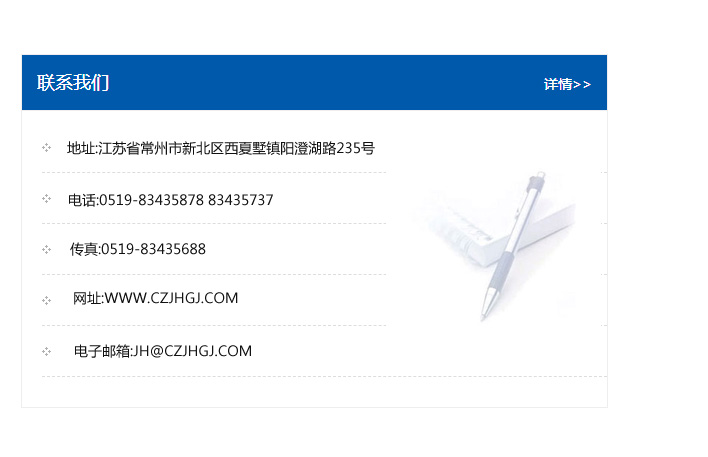 傳真:0519-83435688    郵編:213135    網址:WWW.czjhgj_com.zgife.com    電子郵箱:JH@czjhgj_com.zgife.com